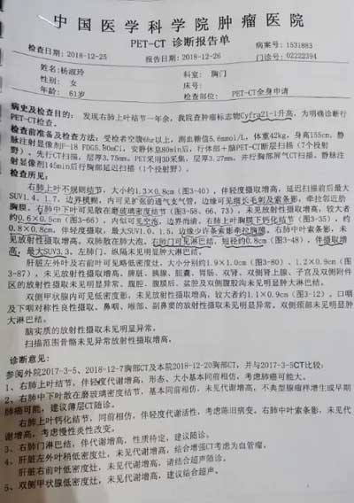 2018年12月,杨淑玲的病情急转直下,除原有的症状外,她还出现气促、咳嗽痰中带血的症状。于是,在家人的陪同下,她来到首都北京,走进中国医学科学院肿瘤医院的大门,12月7日、26日她分别在这里做了两次全身CT检查,结果确诊:杨淑玲患上了肺癌。
